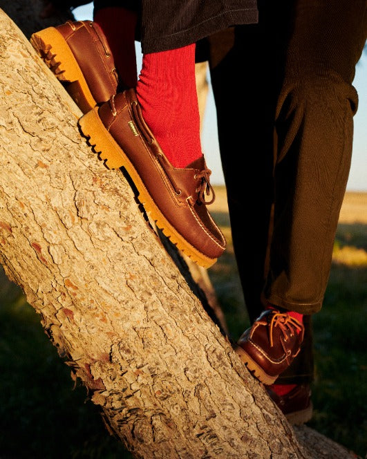 Created to welcome the colder season, these sturdy mocs were born combining the classy comfort of an iconic boat shoe vamp and upper with the endurance of a thick honey gum commando sole that grants weather-resistance and improves stability and traction. Hand-sewn by the finest craftsmen with hot stuff buffed leather especially conditioned with a rich combination of oils and waxes to provide a natural polish quality, they feature leather sock lining and a 360 rawhide lace system. Their name, "Ranger", well reflects their innate love for the wilderness and the great diversity of terrains, habitats of landscapes offered by Nature.
